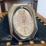 8-kantig metallram. Motivet är ett urklipp ur Svenska Familjejournalen SVEA från 1890.