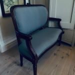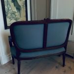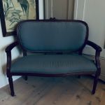 Liten barnsoffa i nyrokokostil. Mörkbrun lasyr. Blå klädsel - fint skick på stoppning och tyg.