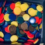 En mängd små plastbrickor att lägga på brickorna, plus en massa gamla 1-öringar som komplement.