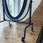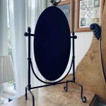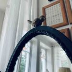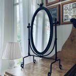 Bordsspegel metall. Vippbar spegel. Liten fågel i "guldfärg" på krönet.