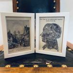 Dubbelram i trä (ej antik) - motiven, från dels Lund, dels från "Det inre af en mekaniks uppfinnares hufvud" är urklipp ur Svenska Familjejournalen SVEA från 1890.