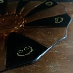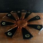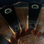 Gulorange glas med svarta och guldiga handmålade detaljer.