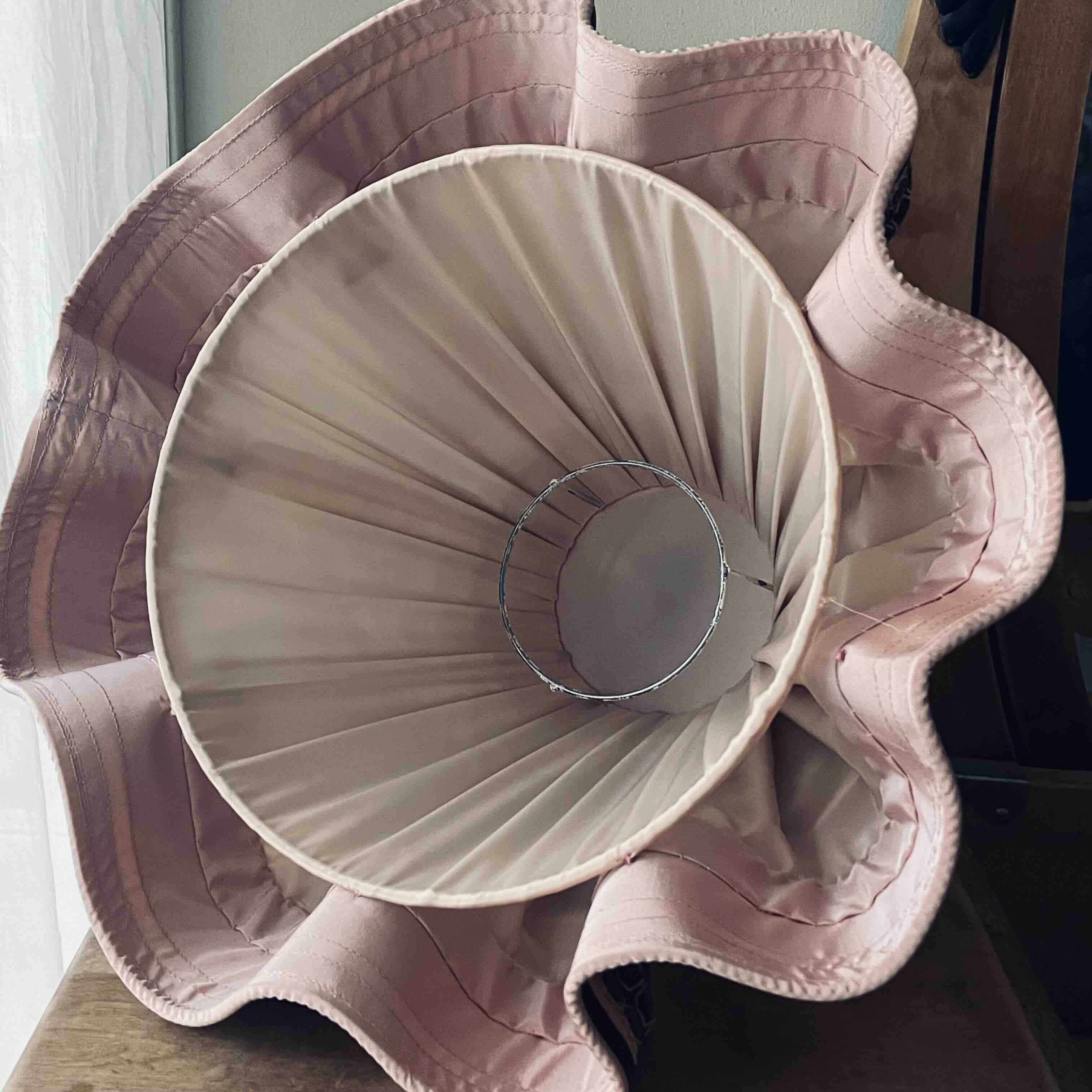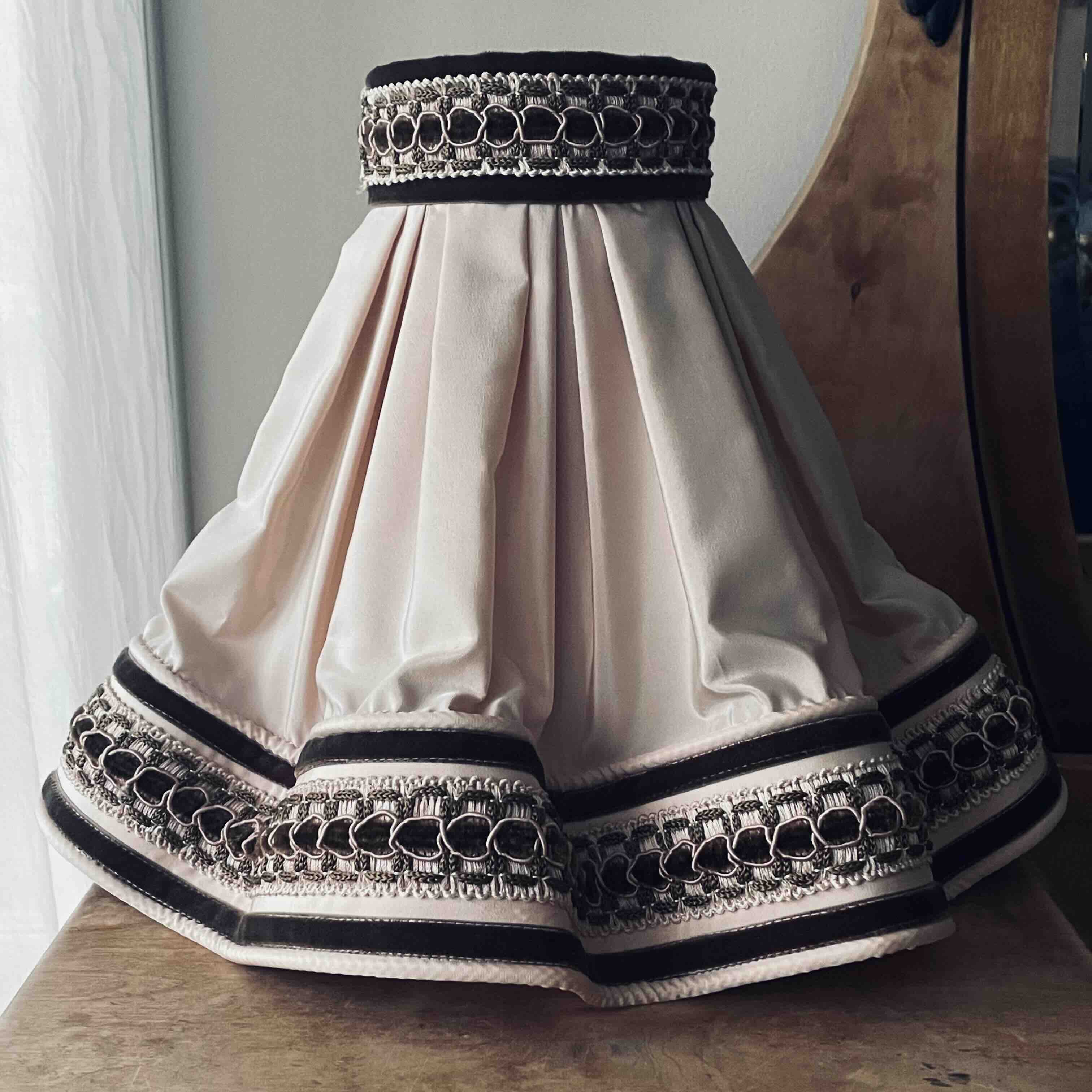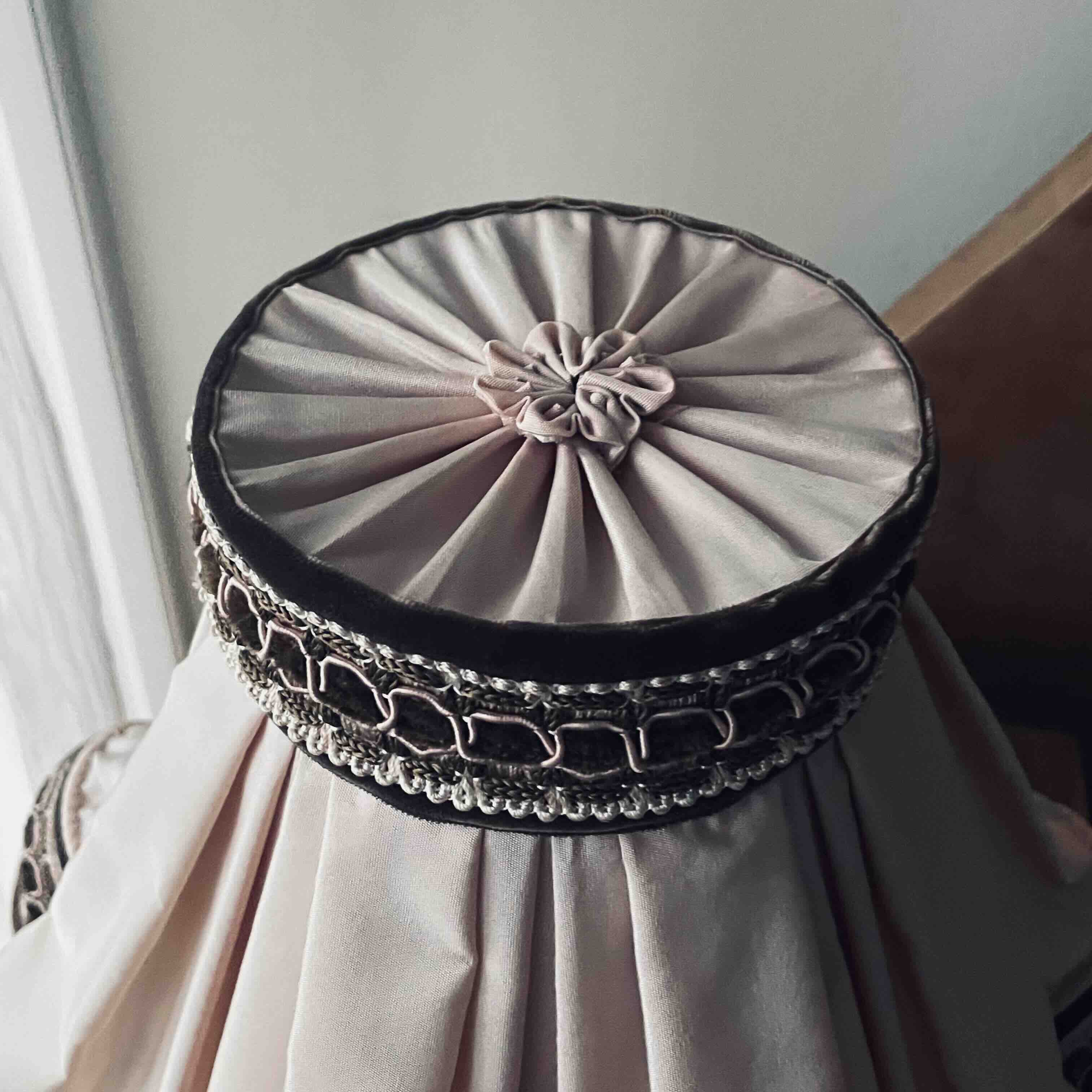 Innerskärm med beigefärgat satintyg och sedan en ytterskärm i dovt beigerosa med bruna sammetskantband.