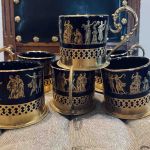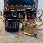 Glögglas - set med 6 st. Mycket dekorativa! Blått glas med guldiga detaljer, i metallhållare.