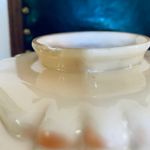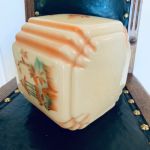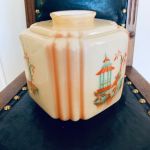 Glaskupa till taklampa. Mycket fin. Gul/orange med gröna inslag. Kinesiskt motiv. Litet bortfall längst upp vid ringen, men detta döljs ju av din upphängning. Mått: Höjd: 18 cm. Bredd: 18 cm. Ringens diameter (allra längst upp vid kanten): 7,9 cm.