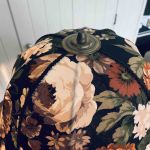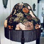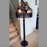Golvlampa i brunlaserad trä med stor blommig skärm.