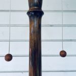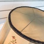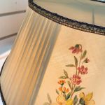 Helt underbar golvlampa i trä med unik antik skärm. Det går inte att få tag i sådana vackra skärmar idag, och till på köpet är den superfin trots sin ålder. Skärmen ligger löst på en så kallad skärmlyra.