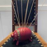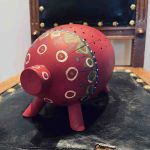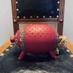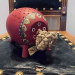 Julig trägris med små hål i. Handmålad. Knorr av flätade träsnören.