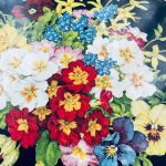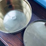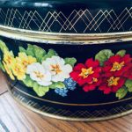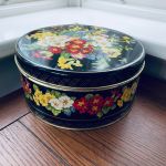 En sån dekorativ äldre rejäl kakburk - svart botten med blommotiv i starka färger.