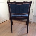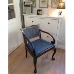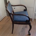 Blåmönstrat äldre tyg - rent och fint med några små lösa trådar i kantbanden. Går finfint att behålla, annars är det lätt att klä om denna stol med löstagbar sits.