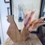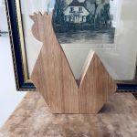 Påskhöna i trä med fjädrar. Hål där bak för att kunna sätta i fjädrar.