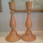 Paret ljusstakar, handsvarvade i bokträ. Signerade undertill. Nedsänkta metallhållare för stearinljusen.
