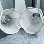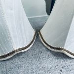 Paret klockformade lampettskärmar i sidentyg. Guldfärgat kantband.