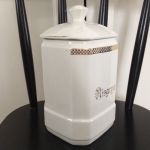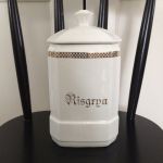 Fin gammal kryddburk i porslin. "Risgryn". Crèmevit med dekoration i guldfärg.