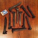 Underbart vackra rälsspikar ("Railroad spikes") från den numera nedmonterade "McCloud Railroad Line", Sonoma, California, US.
