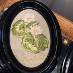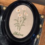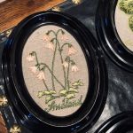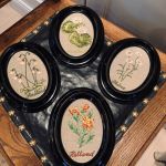 Set med 4 gulliga broderade tavlor med fina svarta ovala ramar.