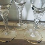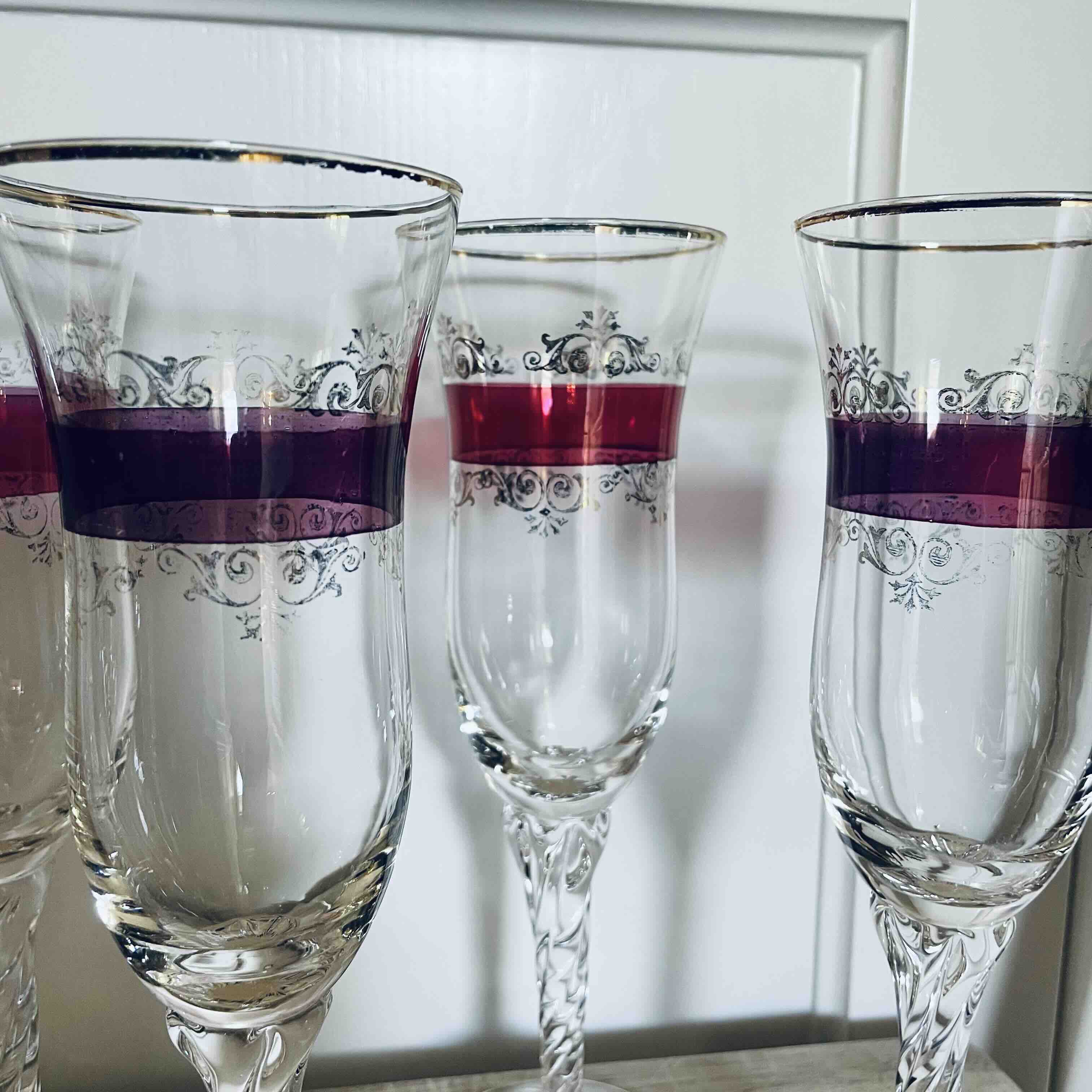 Set med 5 champagneglas. Rosa och lila "band". Bleknad gulddekor.
