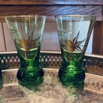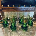 Set med 6 gröna snapsglas med tung fot. Guldiga detaljer. Mycket dekorativa! Superfina på både midsommar- och julbord med sin härliga gröna färg! Mycket fint skick.