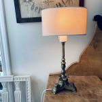 Oval lampskärm med klofäste. Laminerad med bomullstyg.