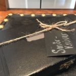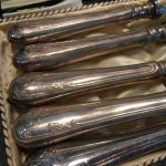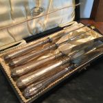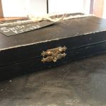 Låda ingår, men ej original (ursprungligen för smycke el dylikt). Knivarna får plats i lådan, men ligger ej helt rakt, se bild.