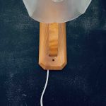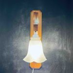 Vägglampa i laserad trä med glaskupa.