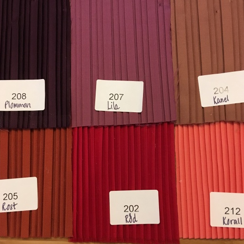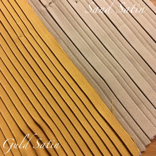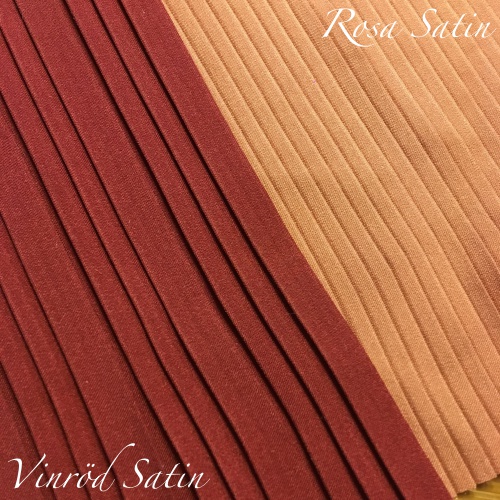 Färgerna Crèmevit, Beige, Sand, Vinröd, Rosa och Guld är ett satintyg som är vänt med den matta sidan utåt. De andra färgerna är ett bomullstyg med något litet grövre struktur än satinet.
