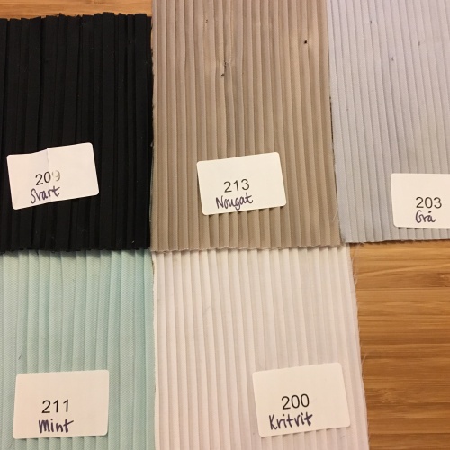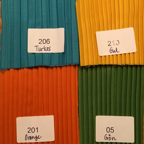 Du kan välja mellan följande färger i listan ovan: Crèmevit, Kritvit, Beige (nyansen går mot ljusgul), Sand, Grå, Svart, Klarröd, Vinröd, Kanel, Rosa, Guld, Orange, Grön, Turkos, Plommon, Gul, Rost, Korall, Nougat och Mint.