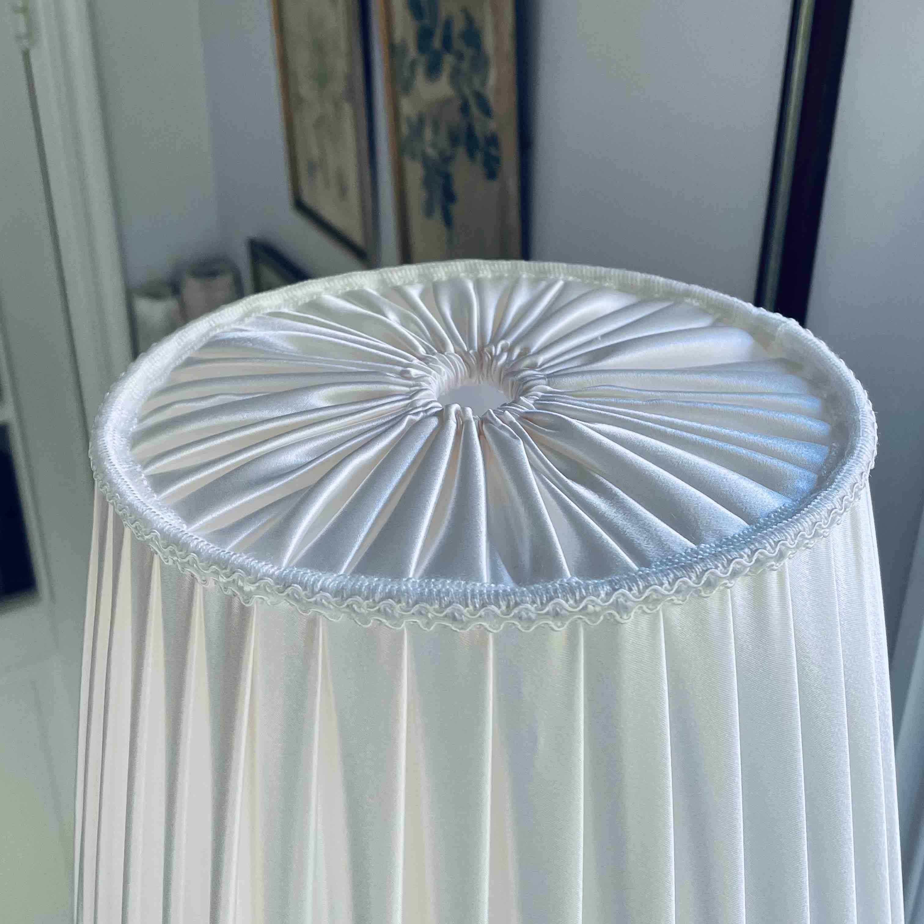 Skärmen är tillverkad i satintyg och är fordrad inuti för ett mycket vackert ljusgenomsläpp. Den har ett färgmatchat kantband längst upp och längst ned, samt en täckt rynkad ovandel (med ett hål i mitten).