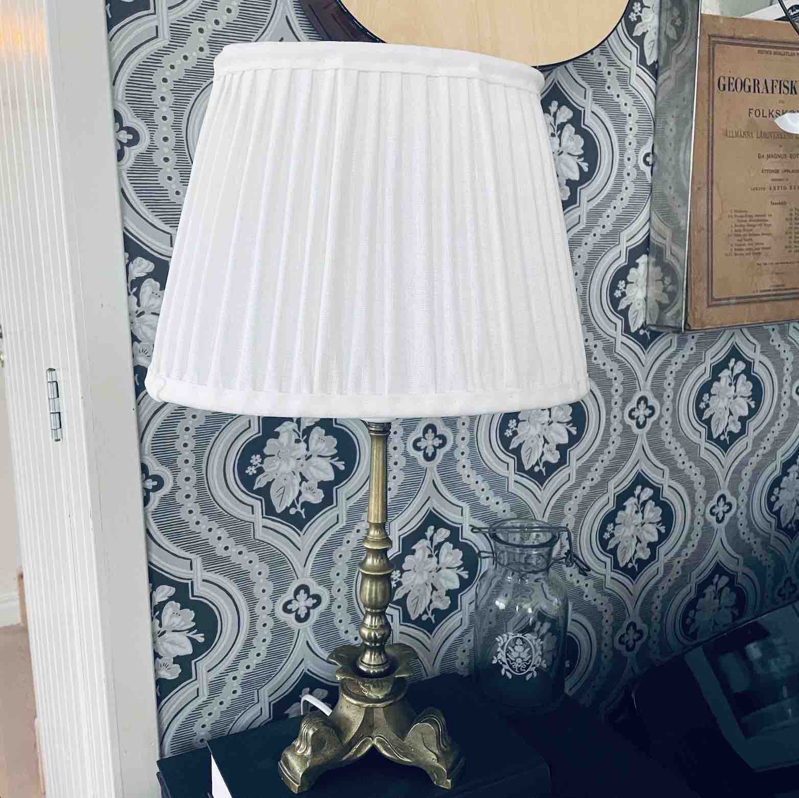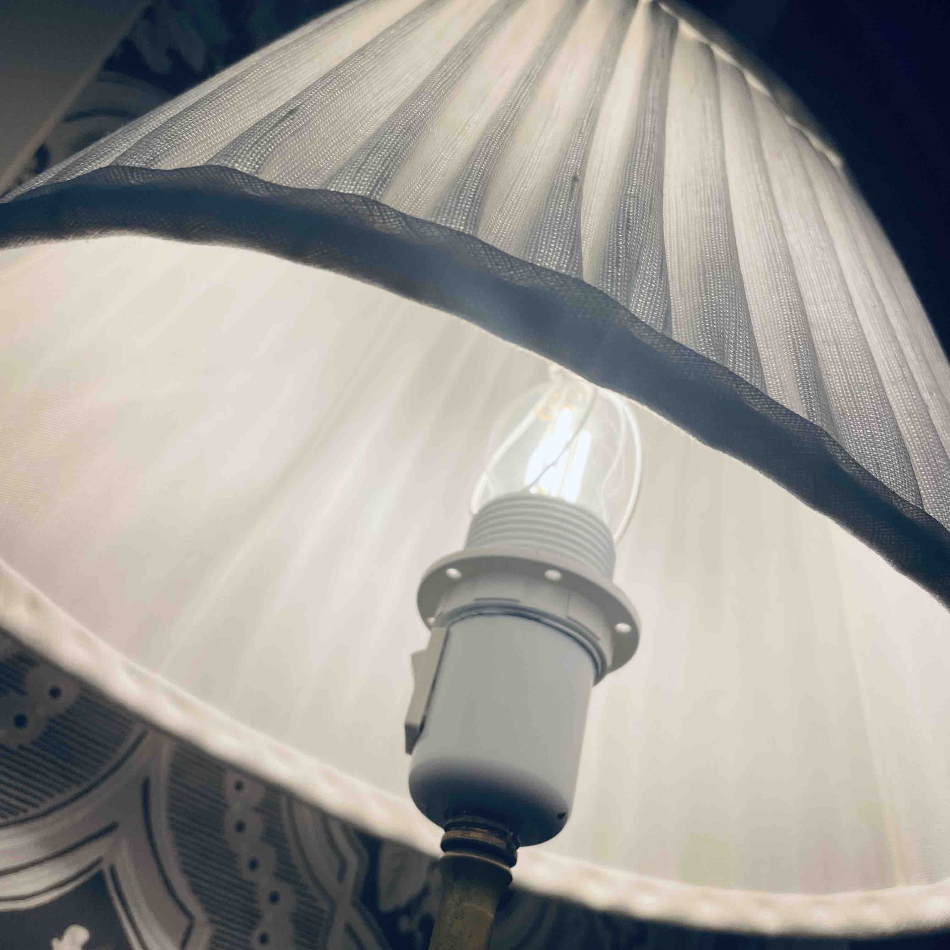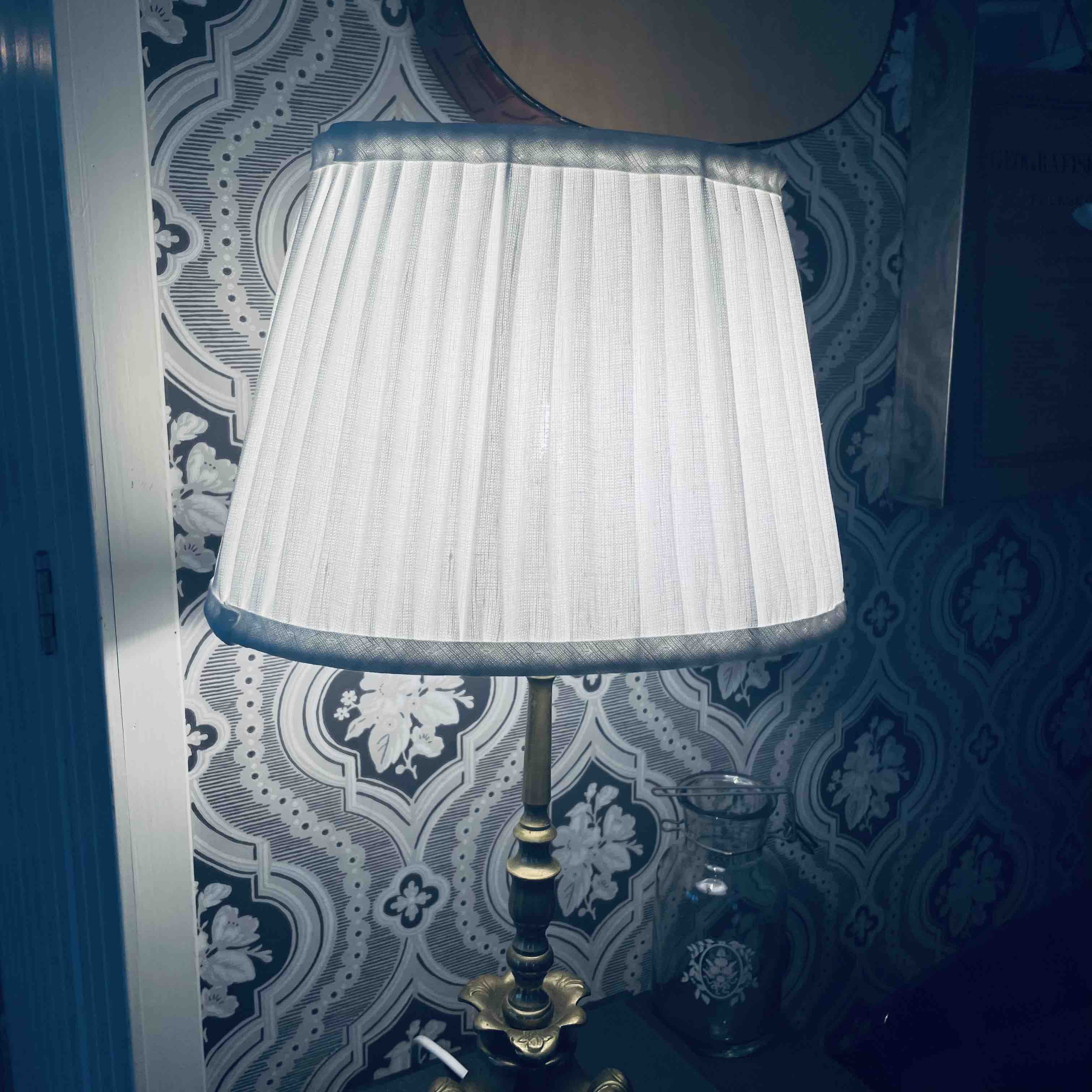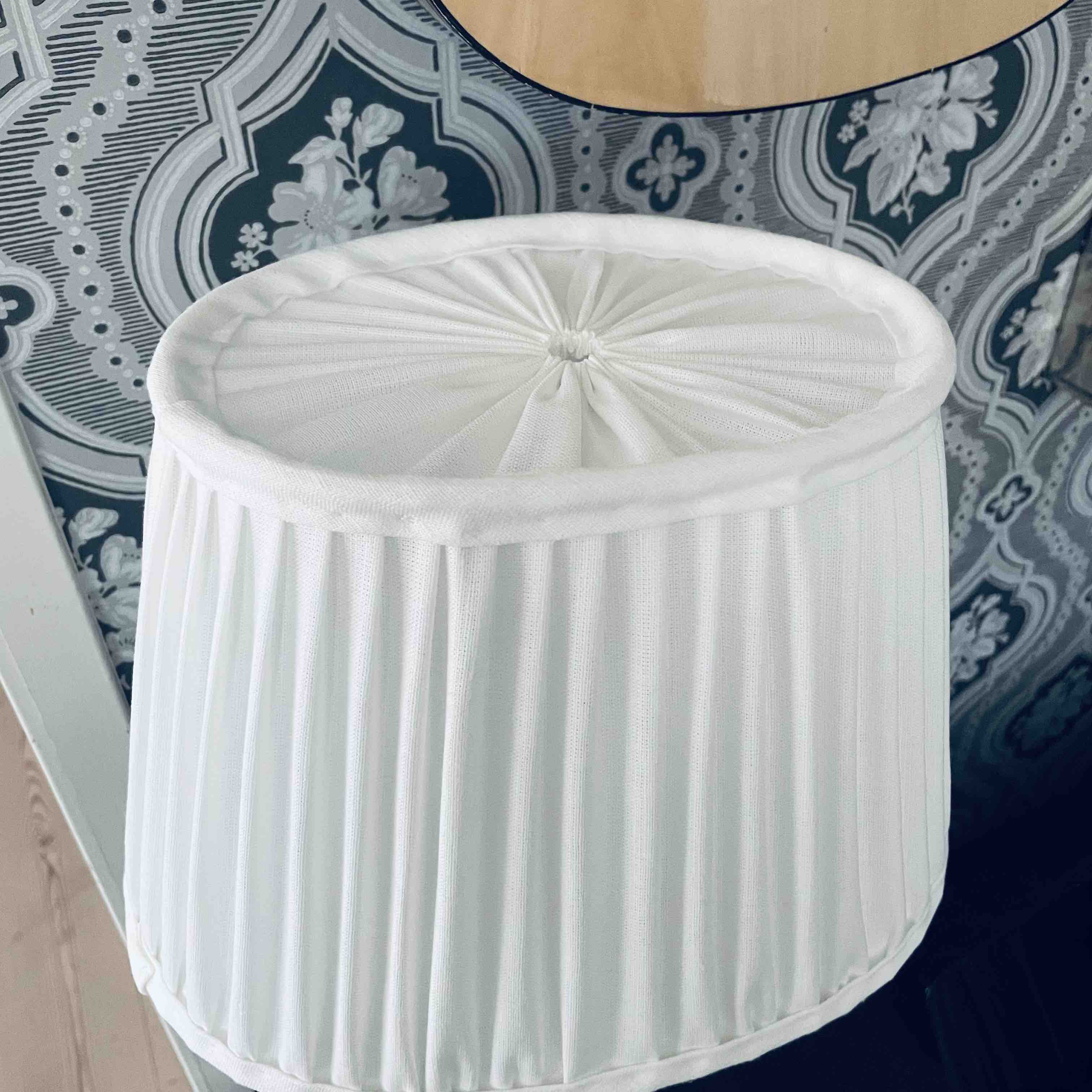 Vacker rynkad linneskärm med bomullskantband, i ovalt format.